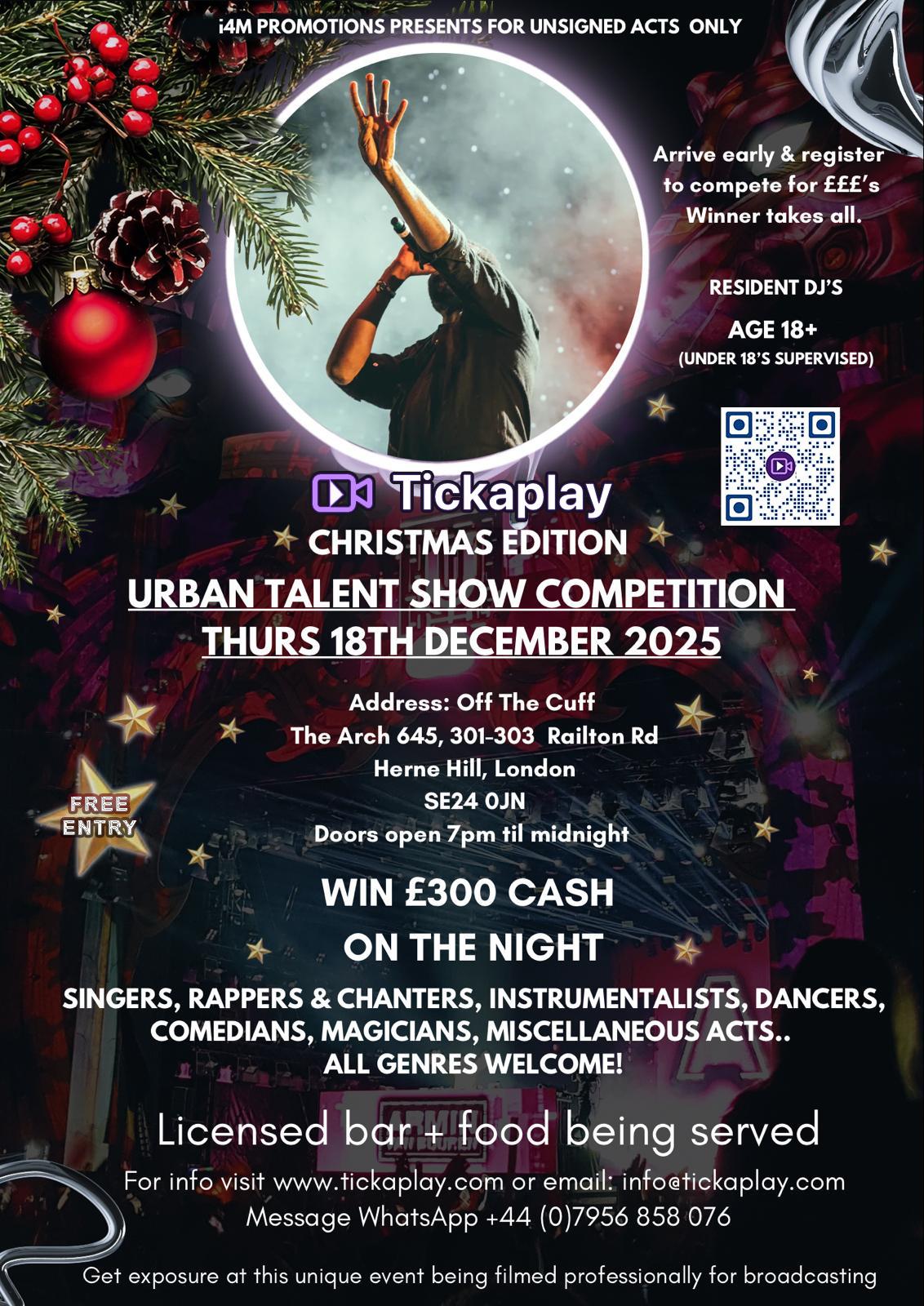 Performers must be 18 years or older to perform at or attend Tickaplay events (currently held at Off The Cuff, Arch 645, 301-303 Railton Road, London SE24 0JN).